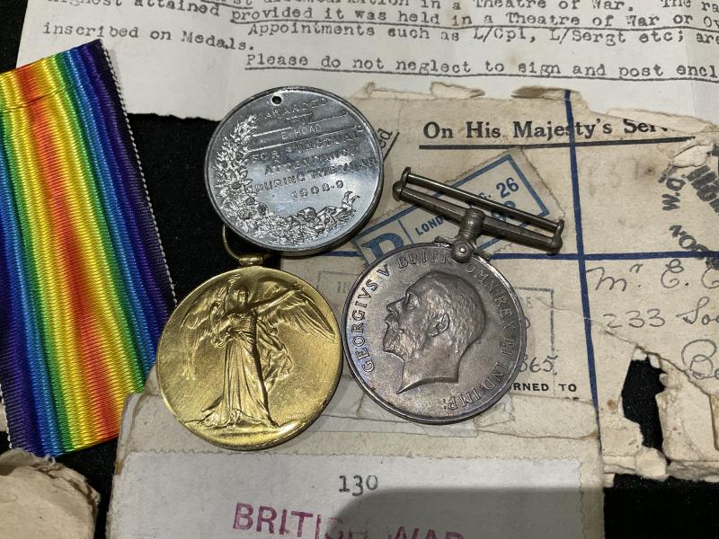 6365 Private Ernest HOAD of the 9th (County of London ) Battalion (Queen Victorias Rifles). Amazing to find this pair of medals exactly as issued 100 years ago still with the original packaging as sent to Private Ernest HOAD. His address being 233 Southwark Park Road, Bermondsey.