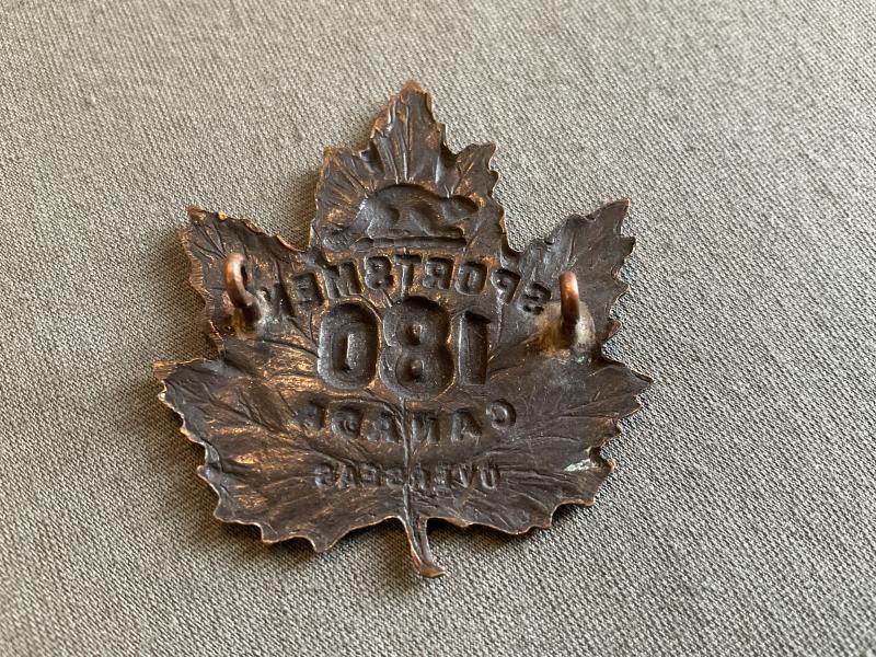 WW1 C.E.F 180th Infantry “Sportsmen” Battalion cap badge. Large blackened copper finished badge in good condition.